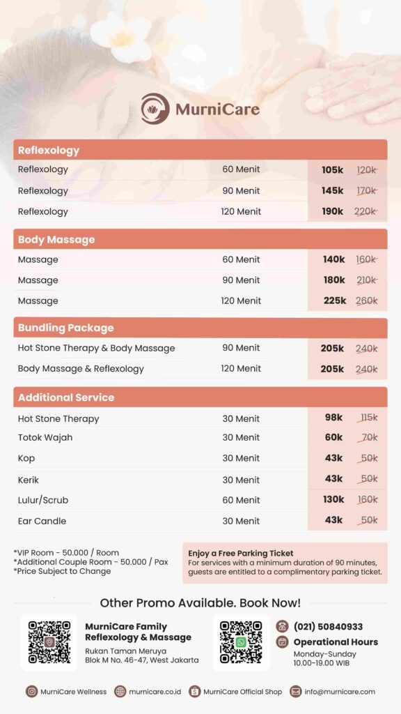Buat kamu yang berkerja di daerah Jakarta Barat dan sekitarnya, MurniCare Wellness punya kabar gembira buatmu. Ada promo Happy Hour yang bisa kamu manfaatkan khusus di jam istirahat kerja (atau kalau kamu mau cuti setengah hari buat refreshing juga bisa banget sih 😉)